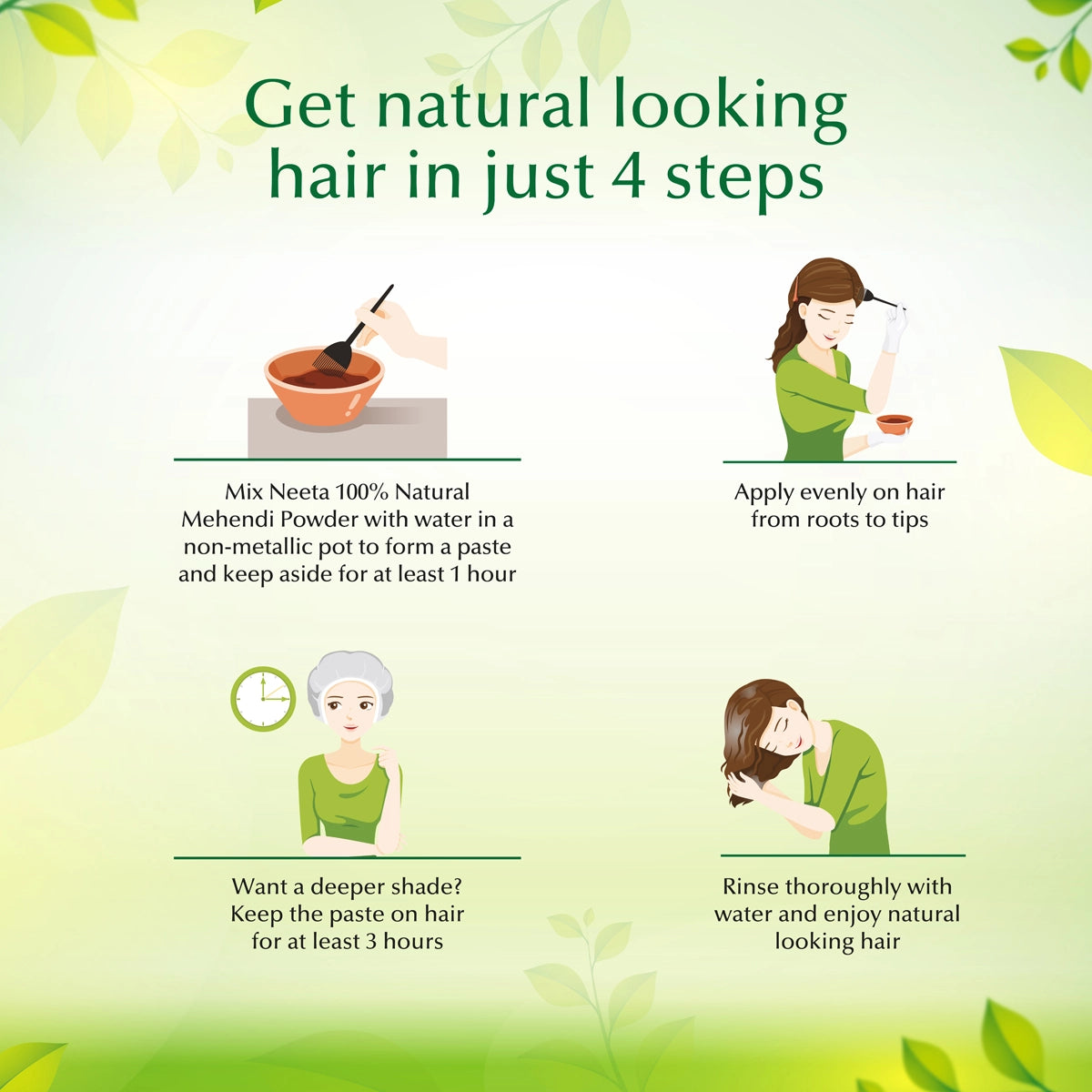 - Mix Neeta 100% Natural Mehendi powder in a non-metallic bowl to form a paste and keep at least for 1 hour.